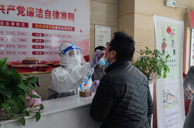 自11月30日起,隨著解除封控回到基地上班的職工陸續增加,有職工提到自己居住地核酸檢測時間結束的早,很怕耽誤了檢測,無法按時上班。分公司后勤保障組組長馬婕立刻多方打聽,詳細詢問,反復溝通,終于得到華山街道辦事處的回復,可以上門對核酸檢測進行培訓和指導。很快,由小組成員李小嬌、張文鳳和物業公司工作人員組成的臨時核酸檢測點籌備完成。