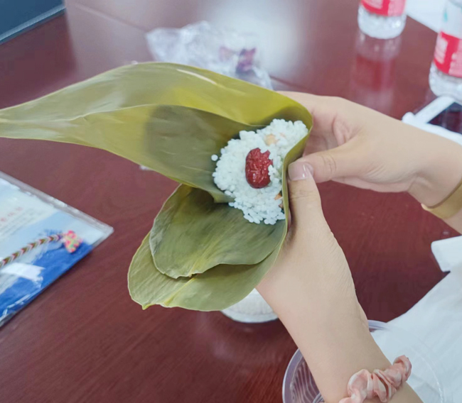 最后一個環節包粽子,提前泡好的糯米、粽葉、大棗、粽線等材料,職工們在老師的指導下互幫互學,卷幾片粽葉、抓一把糯米、放一顆紅棗,雖然很多職工是第一次包粽子,但大家按照步驟一步一步操作,包的是有模有樣,樂在其“粽”。活動現場歡聲笑語、其樂融融。